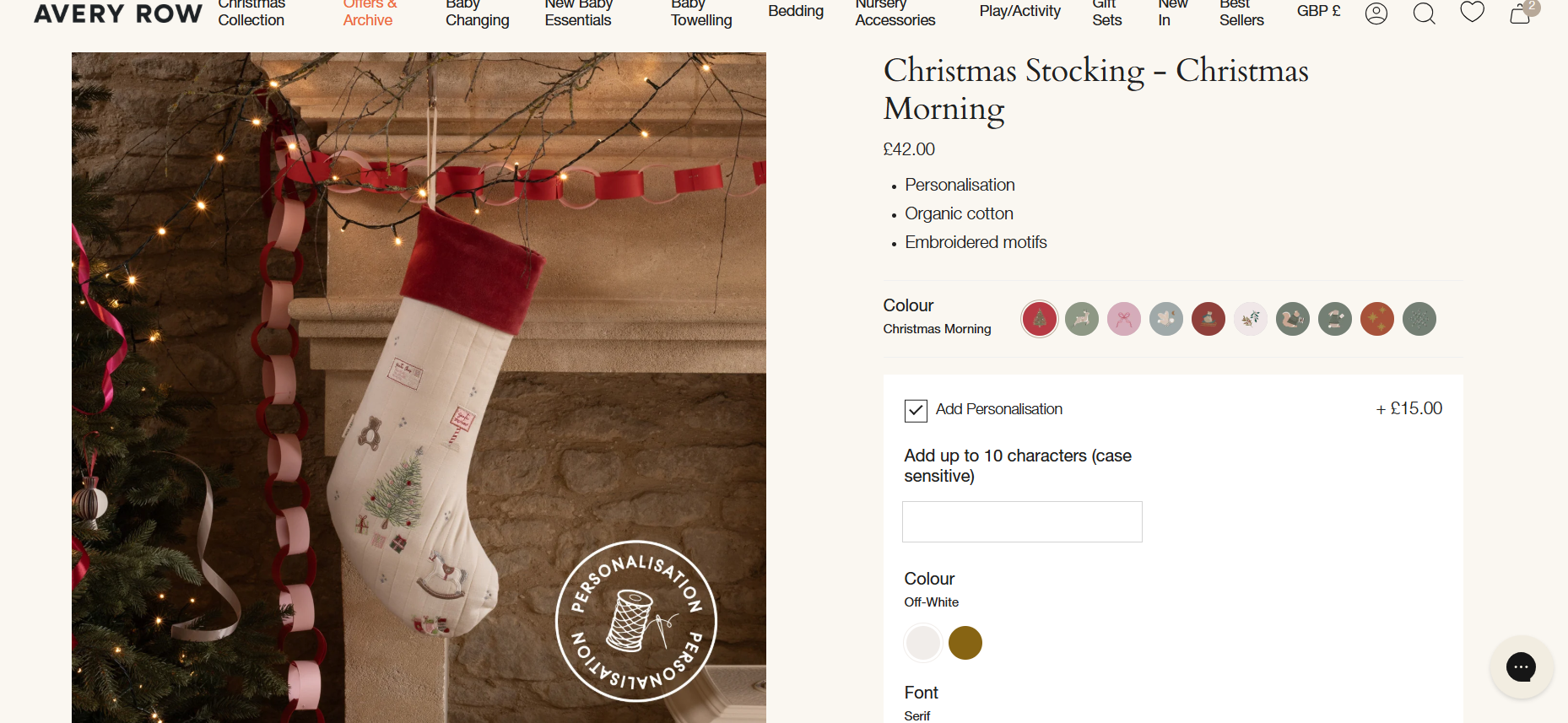 The product page showcases a seamless personalisation feature allowing customers to add up to 10 custom characters, choose embroidery colours, and select a font style directly within the product form. The interface blends naturally with Avery Row’s design aesthetic, maintaining accessibility, performance, and a premium shopping experience while offering complete customisation control.