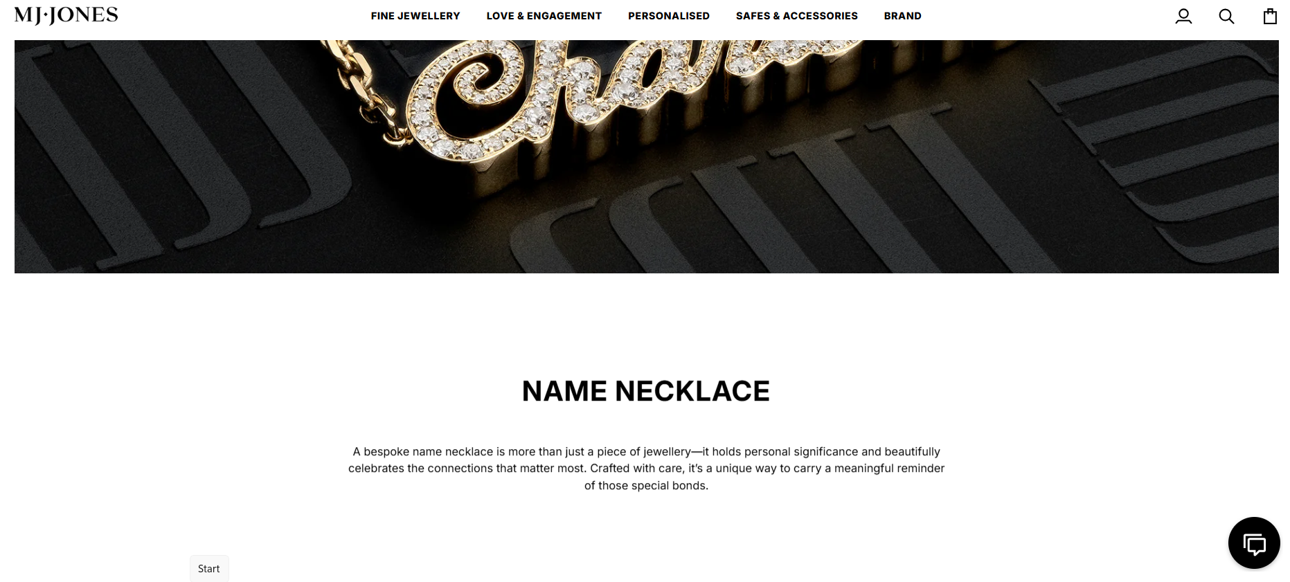 A MJ Jones page showcasing their bespoke name necklace experience on Shopify. The page captures the luxury and emotional value behind personalisation allowing customers to create jewellery pieces that reflect their identity and connections.